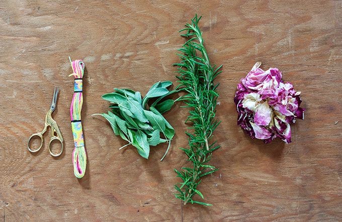 • Des plantes fraiches et séchées au choix : une rose, quelques branches de romarin, du thym, de la sauge, de l’eucalyptus, de la lavande .. ce que vous avez au jardin ou sur votre balcon (Vous trouverez certaines de ces plantes déjà séchées dans des magasins bios et dans les rayons aromatiques de vos commerces)